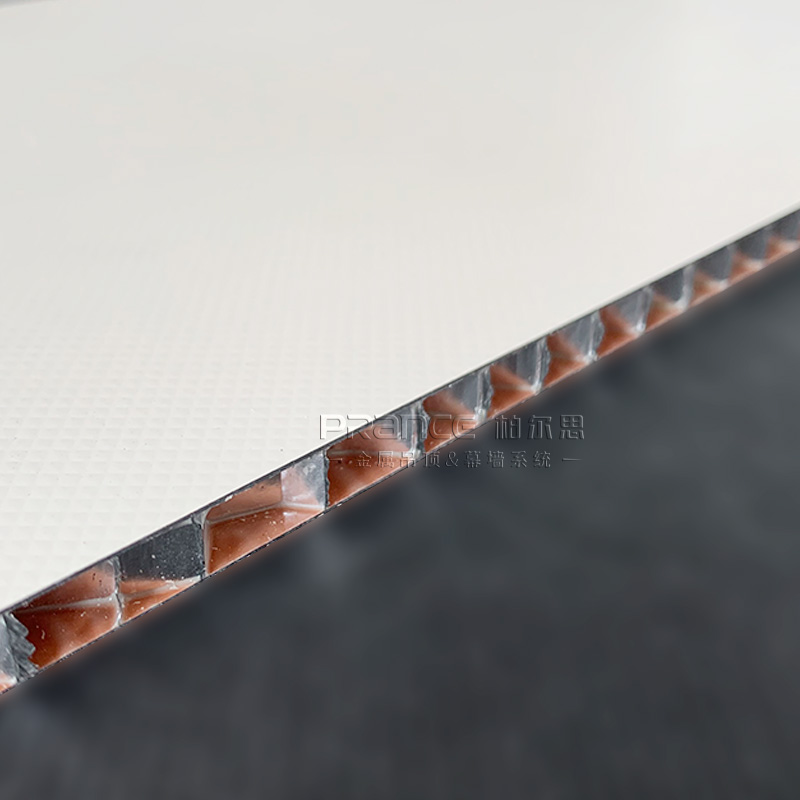 柏爾思蜂窩鋁單板表面處理方式是氟碳滾涂處理,中間是鋁蜂窩。采用復(fù)合工藝?yán)鋲汉蜔釅杭夹g(shù),使得鋁蜂窩板有質(zhì)量輕、隔音、隔熱、環(huán)保、不易碎、剛性強(qiáng)等優(yōu)點(diǎn)。用熱壓成型技術(shù),因鋁皮和蜂窩間的高熱量傳導(dǎo),內(nèi)外鋁皮的熱脹冷縮同步;蜂窩鋁皮上有小孔,使板內(nèi)氣體可以自由流動(dòng);可滑動(dòng)安裝的扣式系統(tǒng)在熱脹冷縮時(shí)不會(huì)引起結(jié)構(gòu)變形。柏爾思蜂窩鋁單板廣泛是用于:大型商業(yè)體,機(jī)場(chǎng)地鐵站等公共場(chǎng)所的吊頂系統(tǒng),室內(nèi)室外墻體系統(tǒng)。